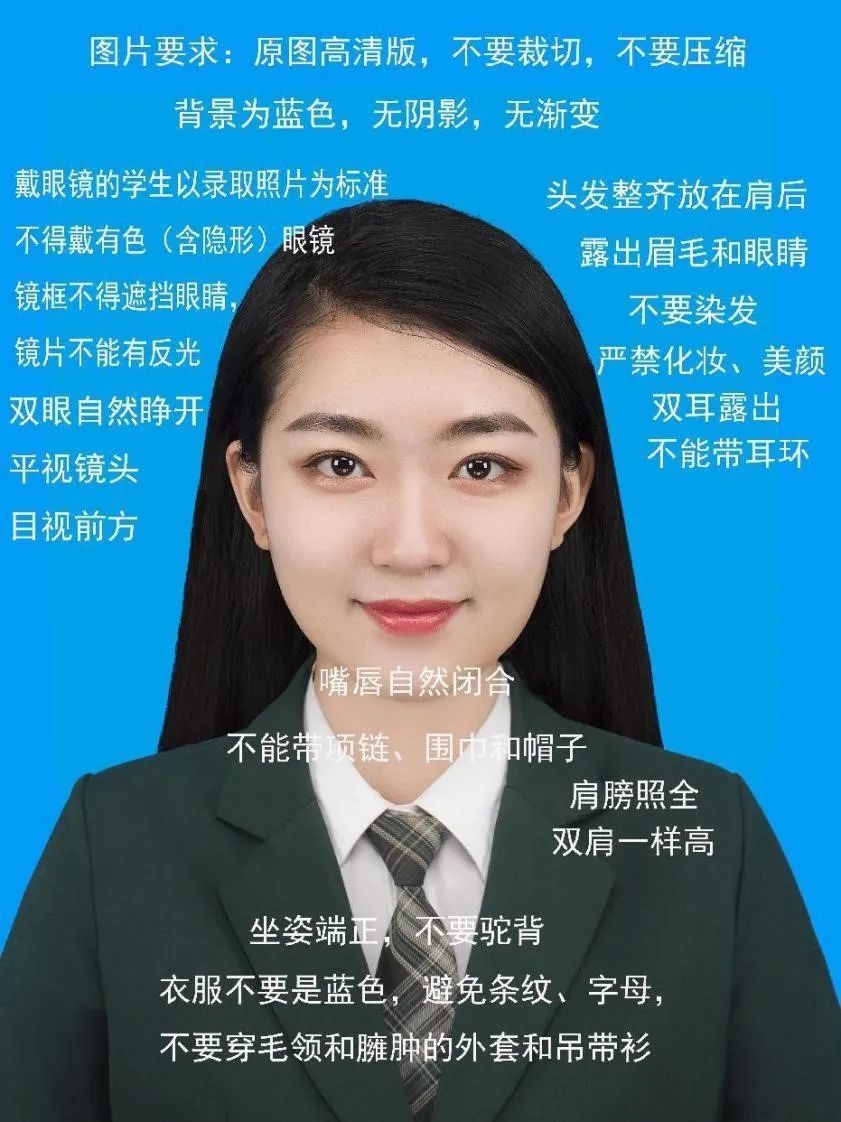 图像信息须正面免冠照,禁穿蓝色衣服(背景为自动生成天蓝色),具体要求见下图。