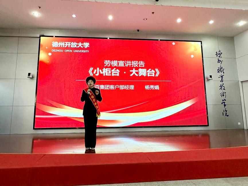 全国劳动模范,全国第十六届工代会代表,德百集团客户部经理杨秀娟作为劳模工匠代表,为全体新生作了题为《小柜台·大舞台》的报告,分享了自己2004年以无痕焊接技能荣获全国服务品牌,在平凡岗位上造就不平凡事迹的奋进故事。