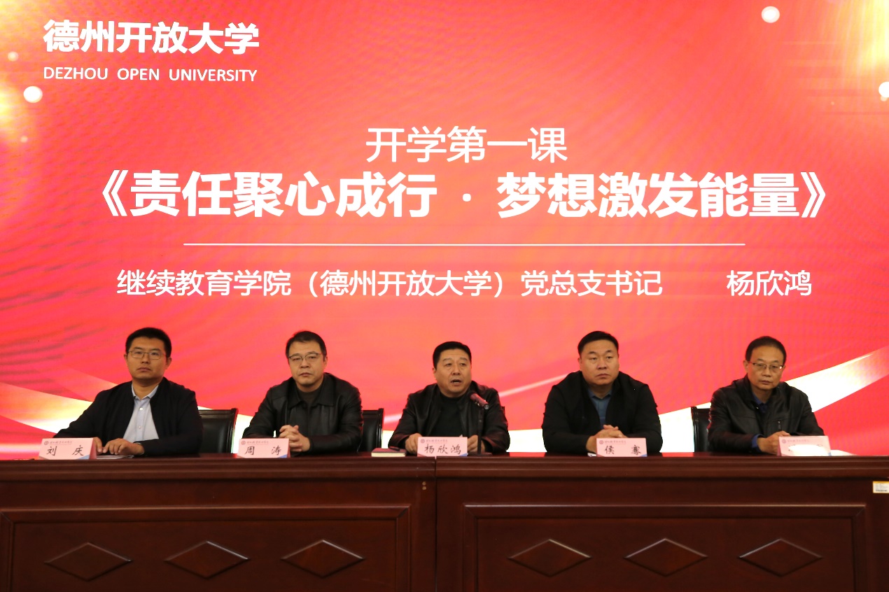 典礼在庄严的国歌声中拉开帷幕。开云kaiyun官方网站(德州开放大学)党总支书记杨欣鸿以《责任聚心成行,梦想激发能量》为题,为新生讲授开学第一课。他详细介绍了学校发展历程、办学现状及发展愿景,并希望全体新生能够把全部的热情、激情、活力投入到个人发展及社会服务中去,在实现个人梦想的同时,发挥个人应有的社会价值,让自己的梦想在社会主义伟大事业的建设中焕发出绚丽的光彩。