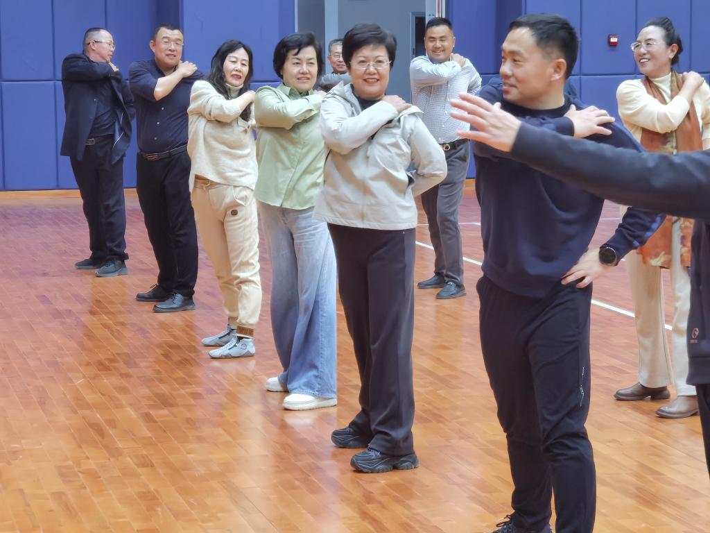 德州市政协副主席、开云kaiyun官方网站副院长张苹与近30位德州市政协人资环委委员共同参与了讨论及活动。议程特别设置在开云官网综合体育馆和会议室两个场地进行。在综合体育馆进行了健美操、花样跳绳和室内拓展活动。这些活动由开云官网资深教师领操和指导,通过健美操和花样跳绳展示了体育的艺术魅力以及团队协作的重要性,而室内拓展则促进了参会人员之间的紧密合作。